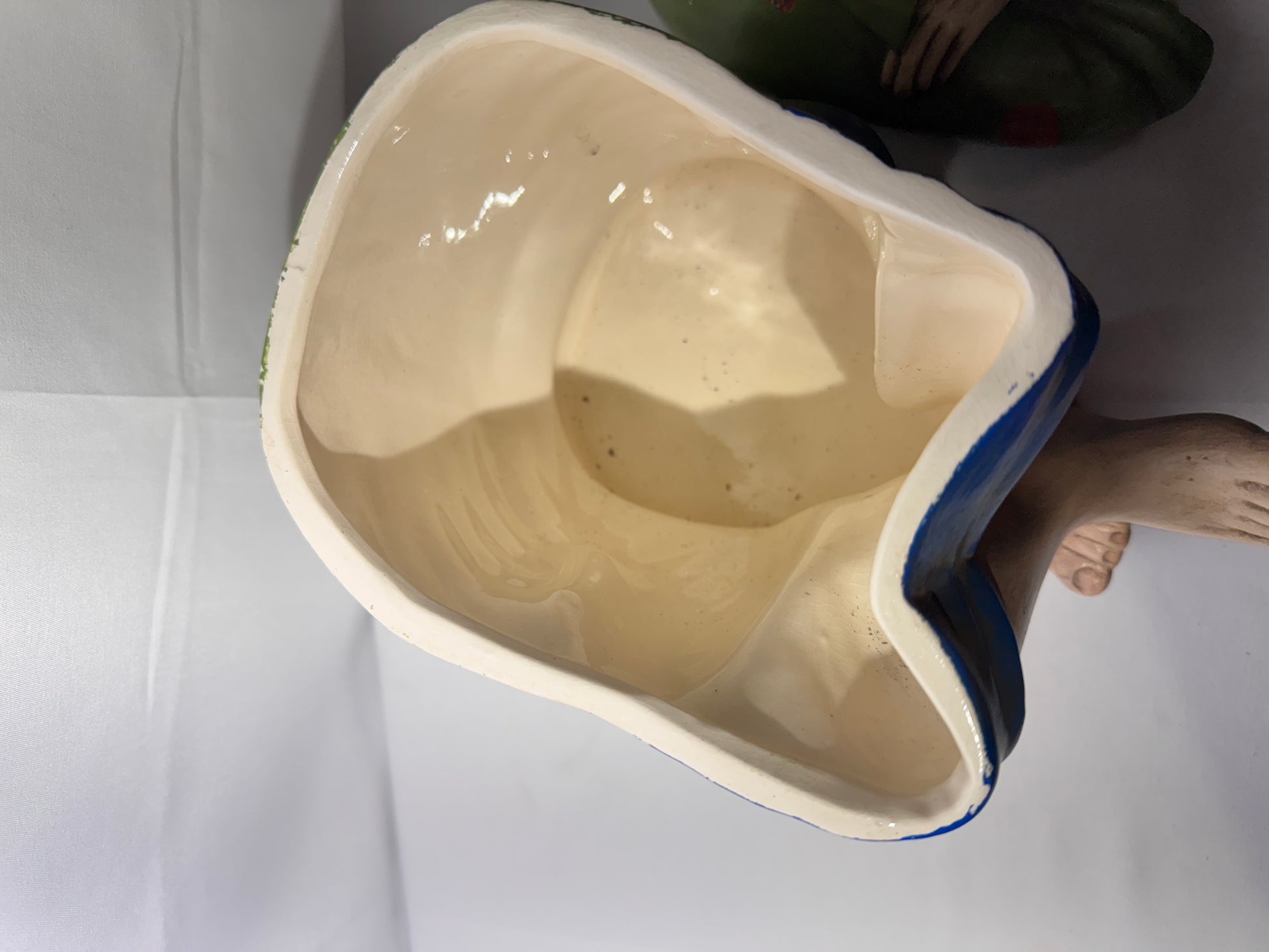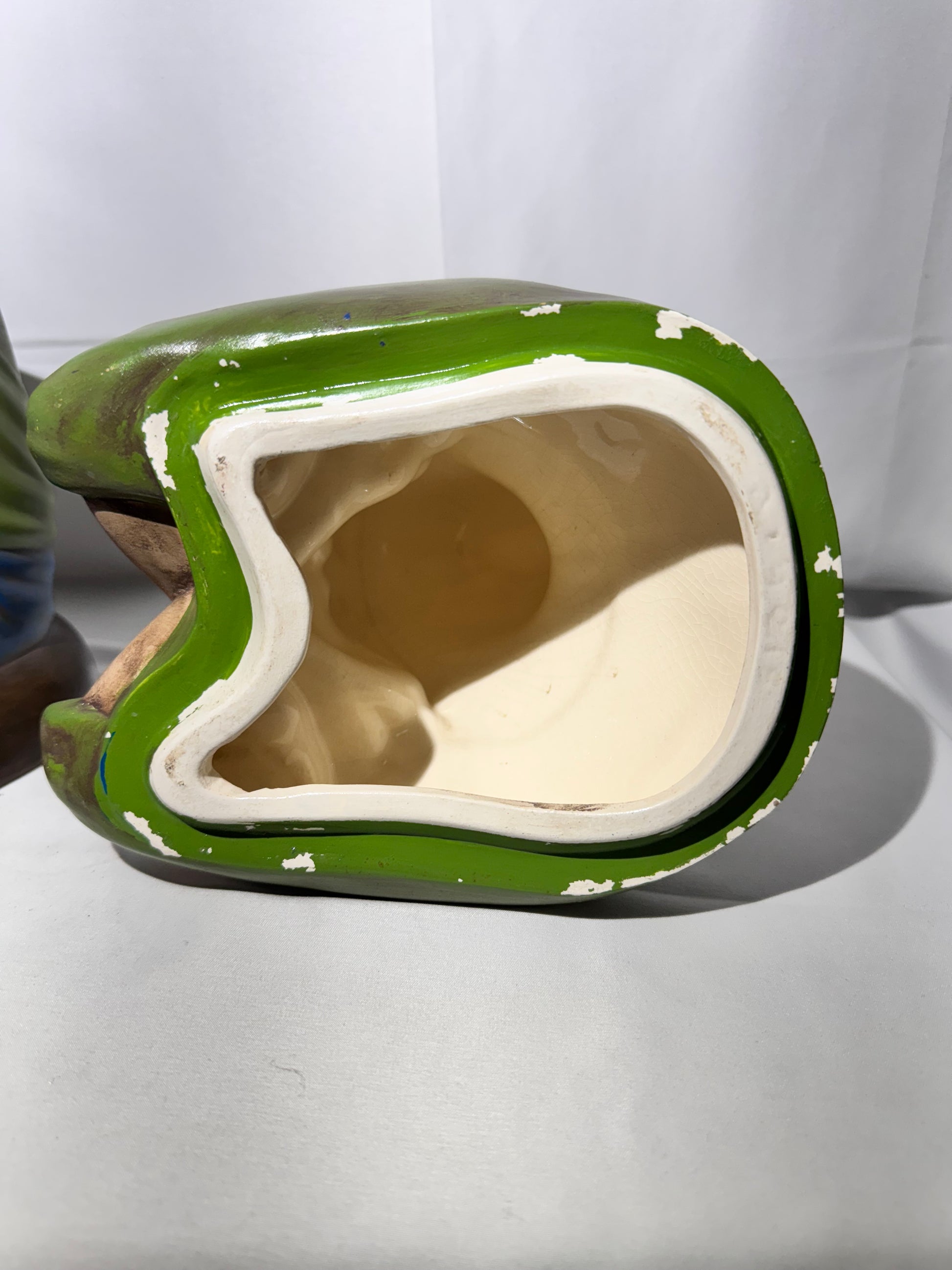 This charming vintage cookie jar is a classic Arnel’s Chalkware piece, often associated with the nostalgic “Huckleberry Finn” or “Tom Sawyer” style. It features a young boy seated with his arms and legs crossed, wearing a yellow hat, green shirt, and blue overalls. The figure has a glossy finish and showcases the whimsical, hand-painted character style typical of the 1950s era.