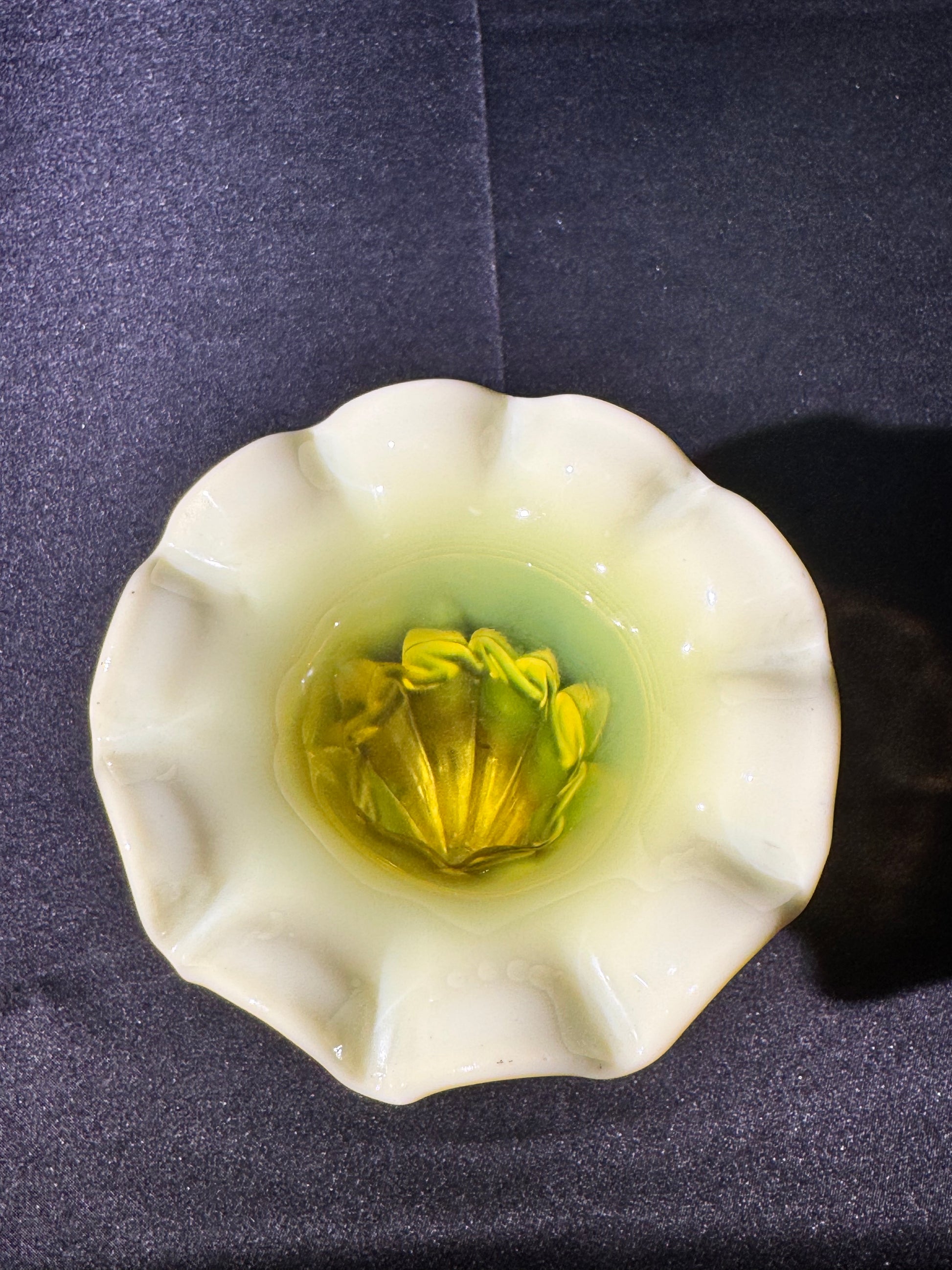 Pearline glass, often referred to as “primrose,” was especially popular in the late Victorian era and is prized by collectors for its luminous finish and delicate detailing. This vase also contains uranium, causing it to glow under UV light (blacklight not included).