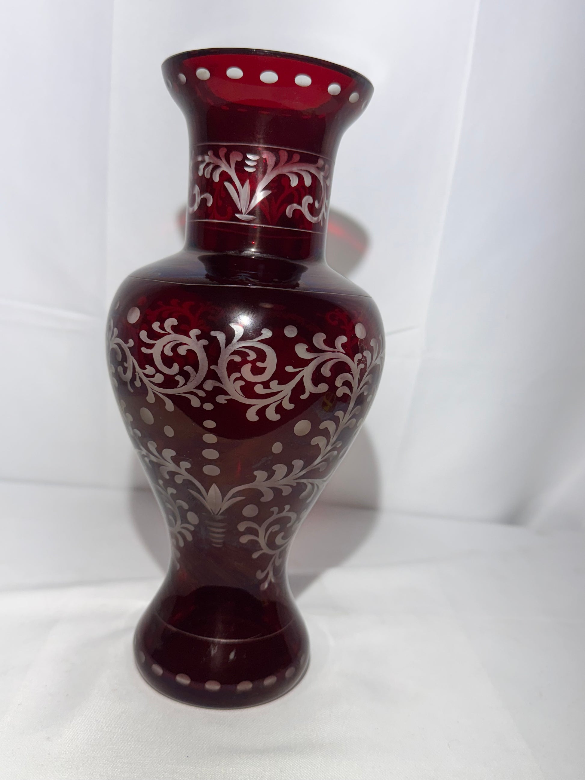 - Technique: Hand-cut cut-to-clear design — the rich ruby red overlay is skillfully cut away to reveal the clear crystal beneath.