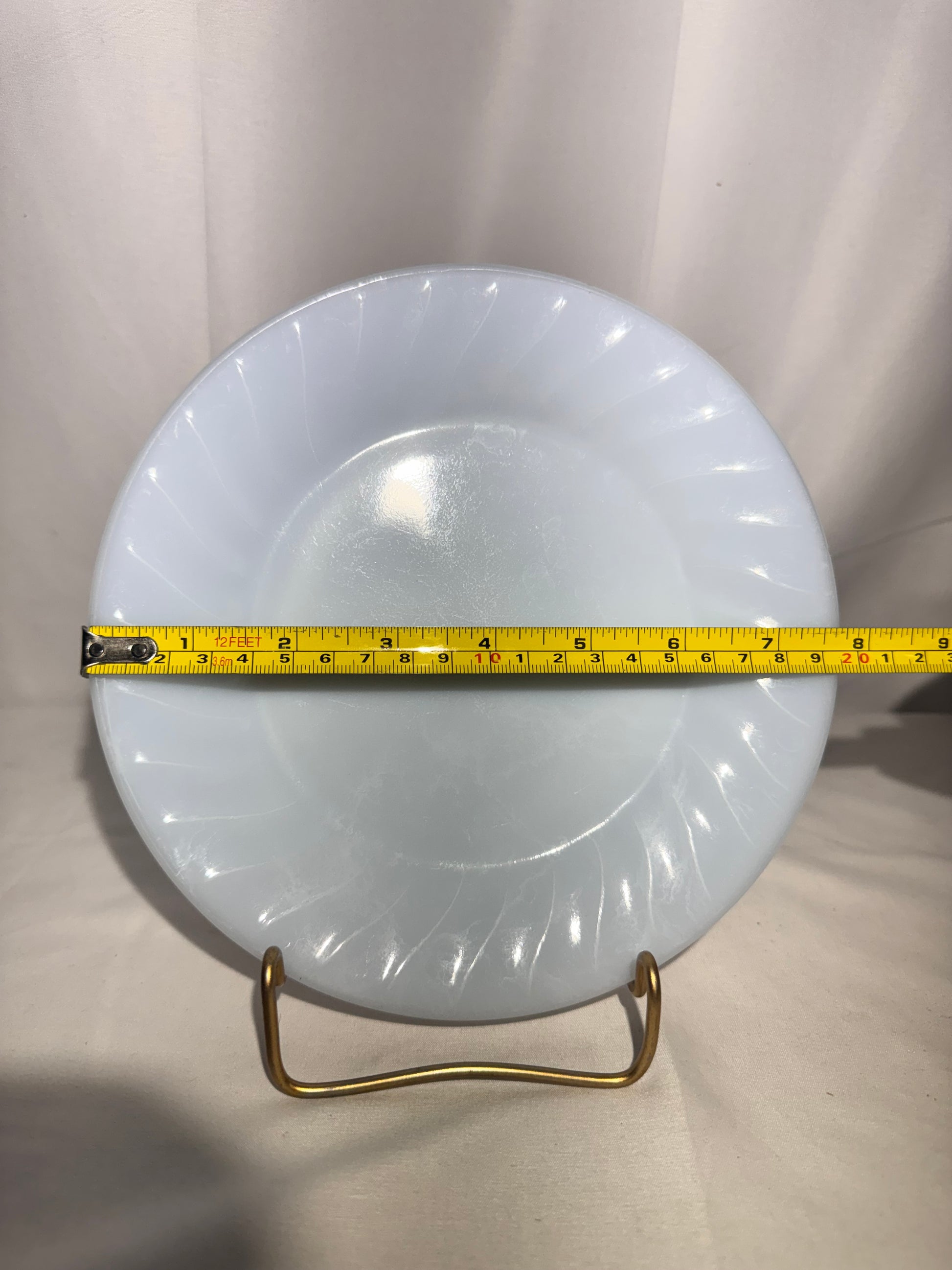 Beautiful vintage Fire-King dinner plates in the highly collectible Delphite blue color. This set includes four plates, each measuring approximately 8 inches in diameter, featuring the classic scallop swirl pattern that Fire-King is well known for.