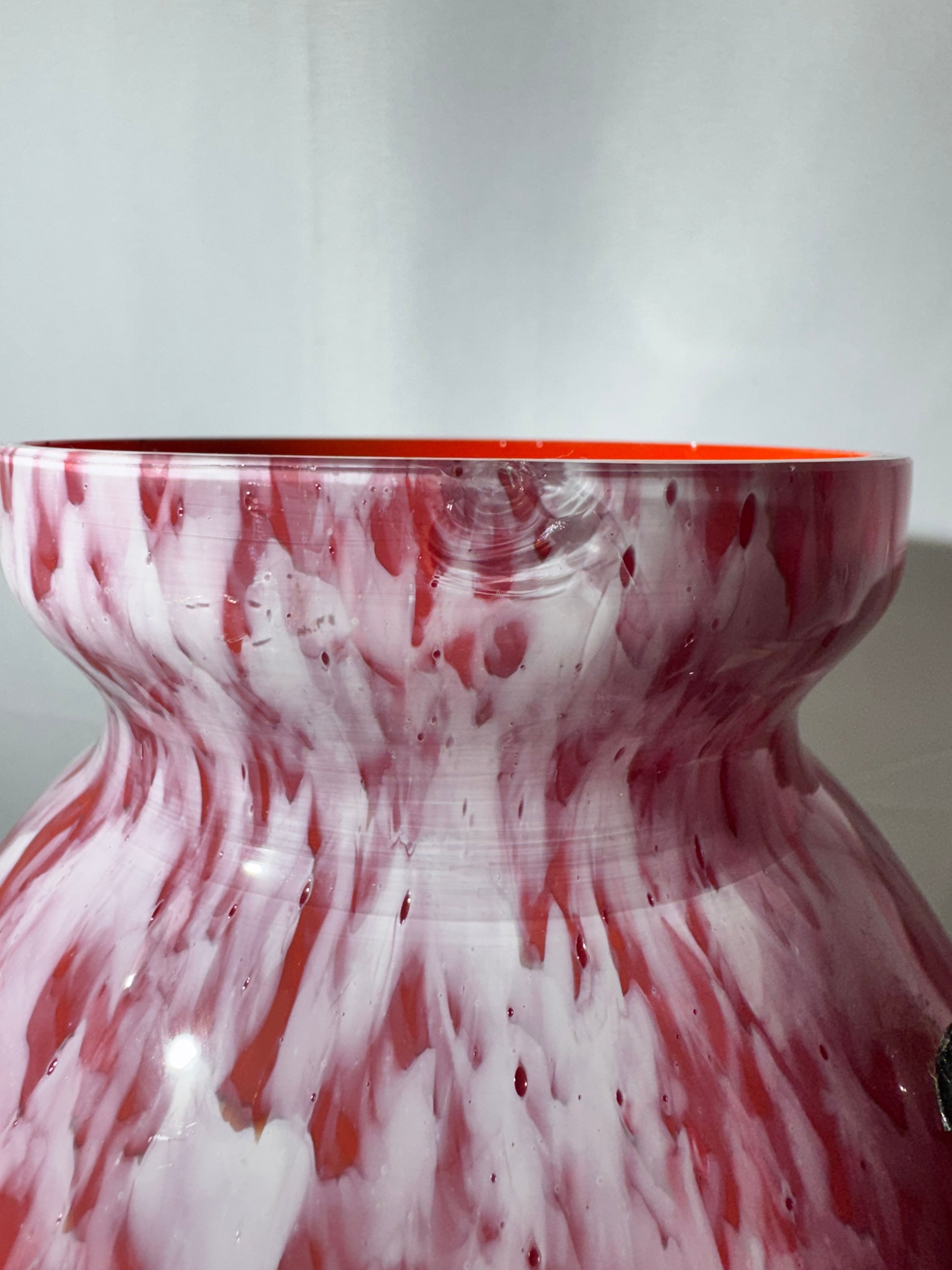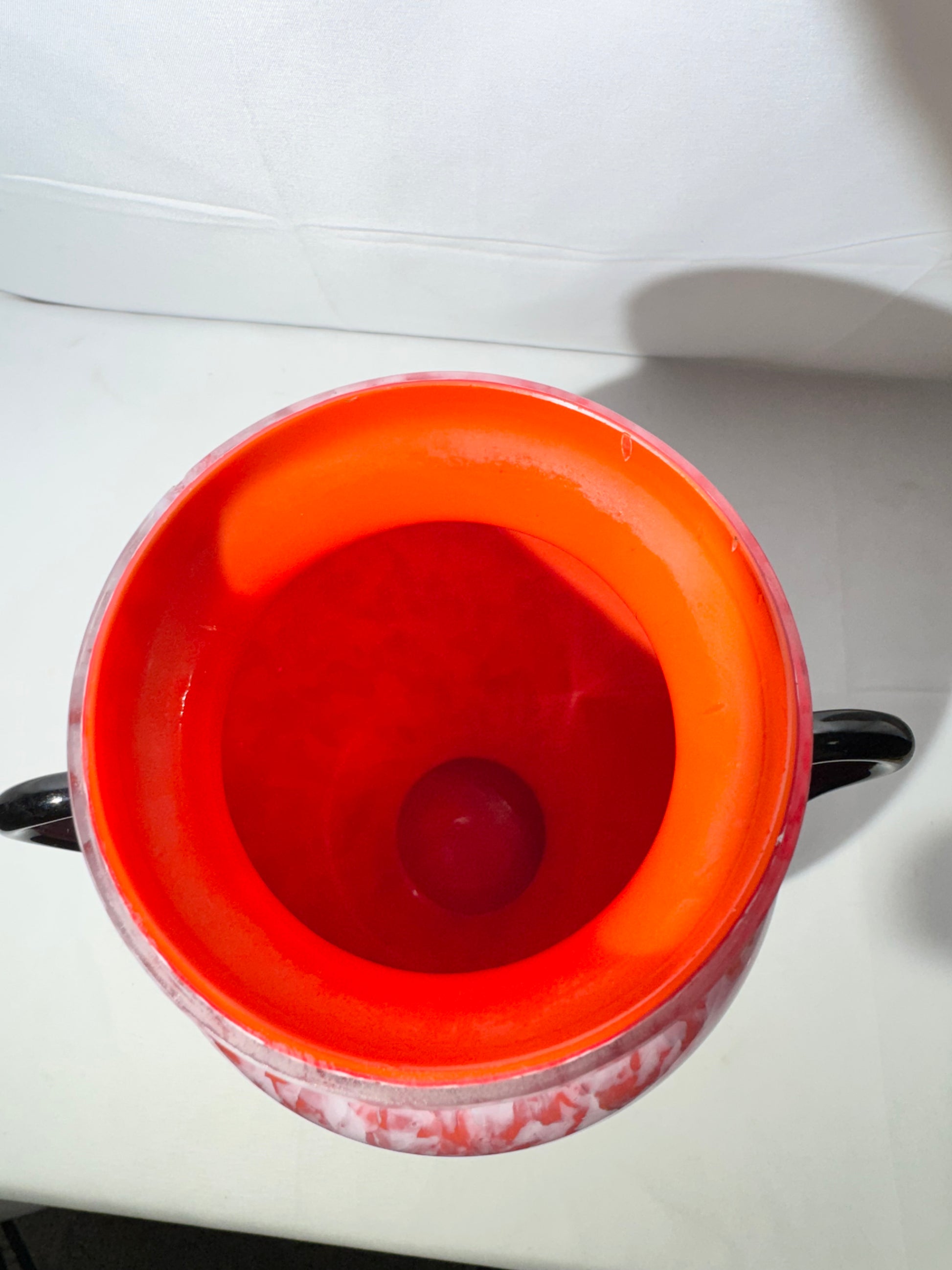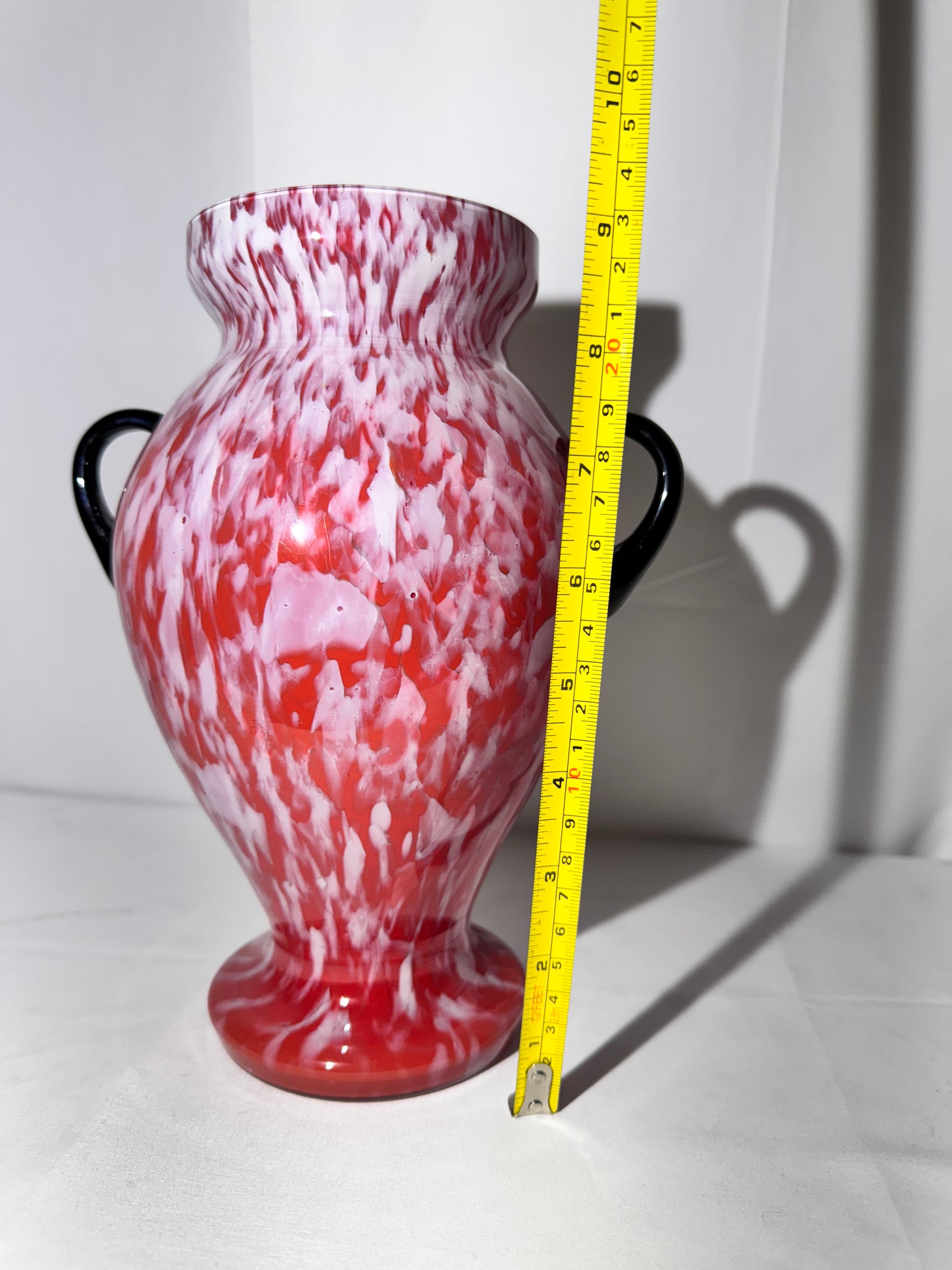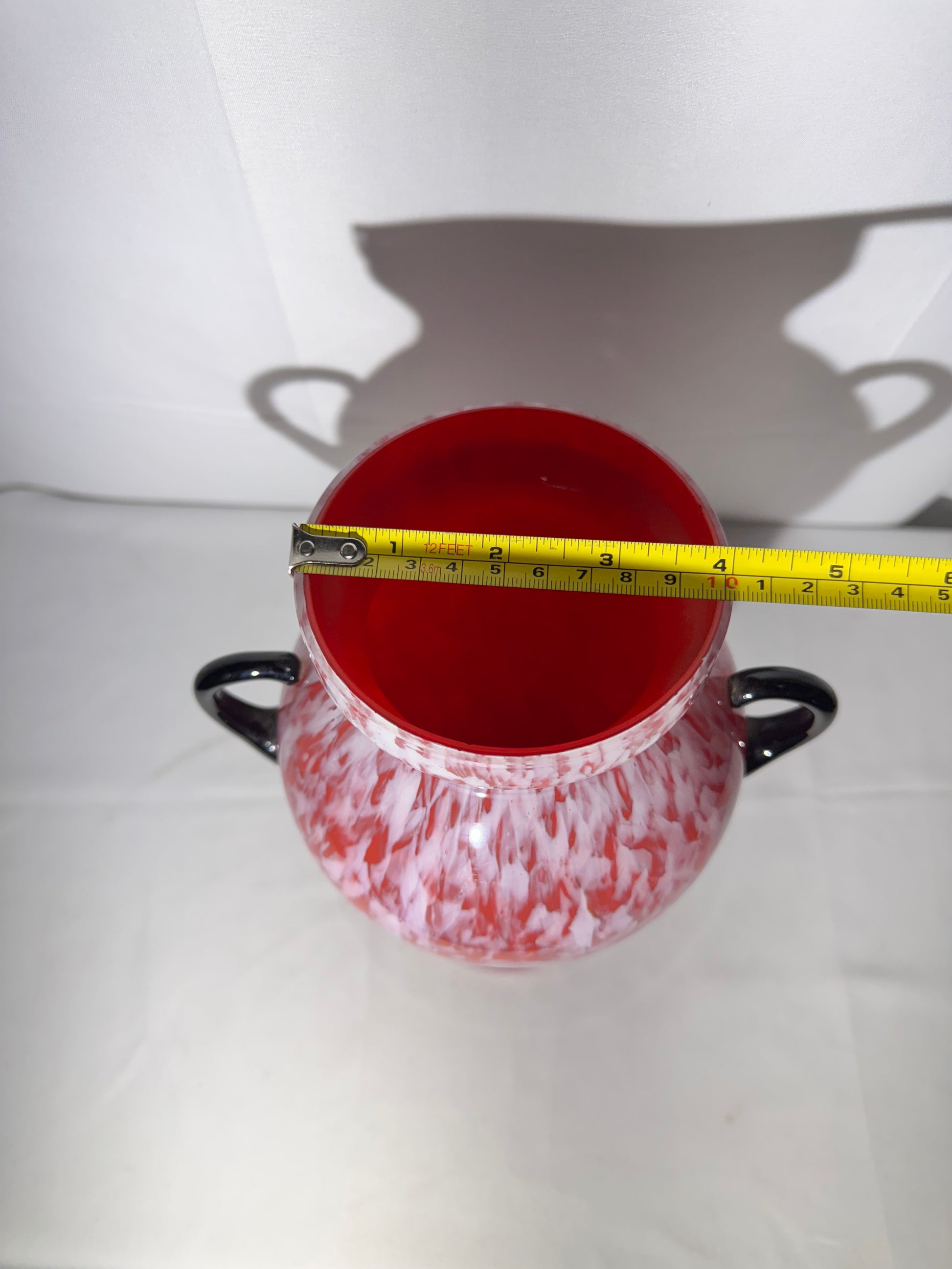 Vintage Franz Welz Czech Art Deco Hand Blown Glass Vase – Red & White Variegated with Black Handles – c.1920s – Morono / Confetti Effect