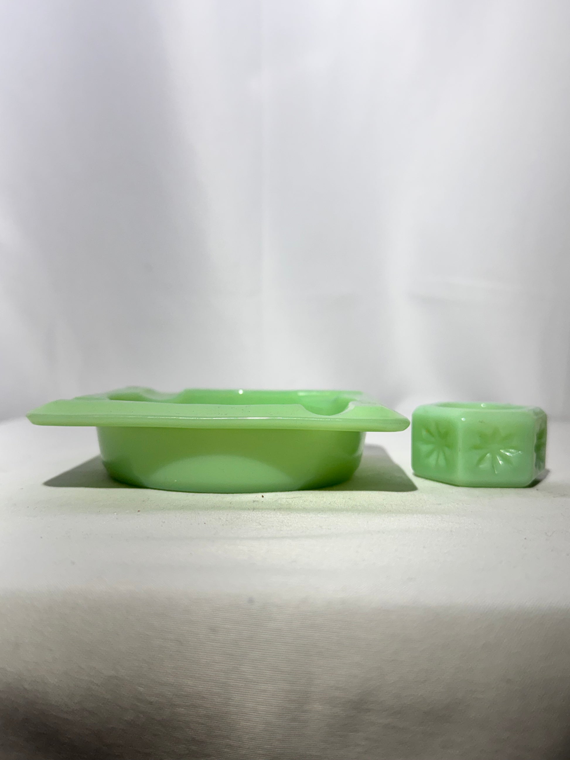 Vintage Jadeite Glass Ashtray Set – Fire-King & Hexagonal Floral Piece