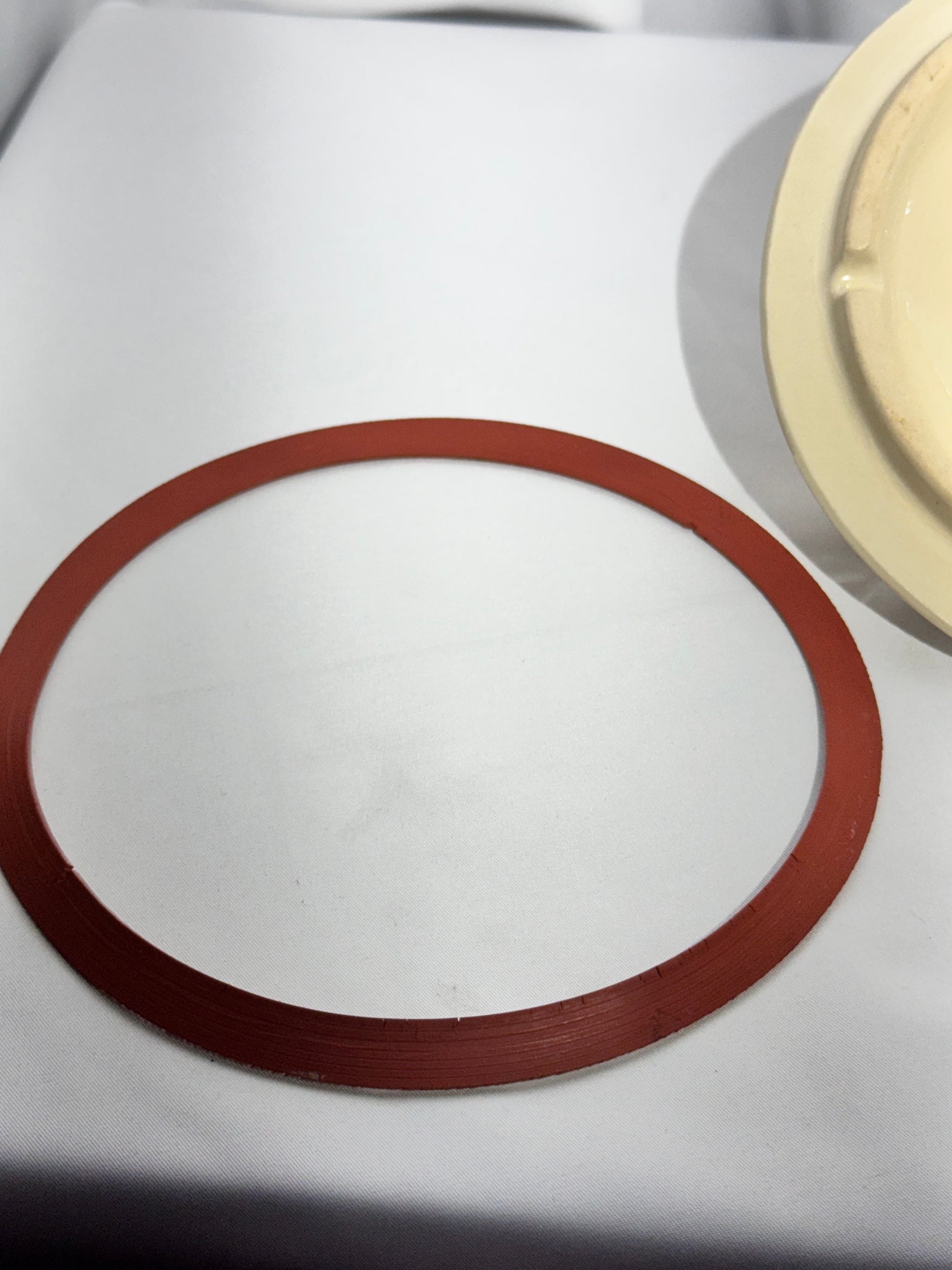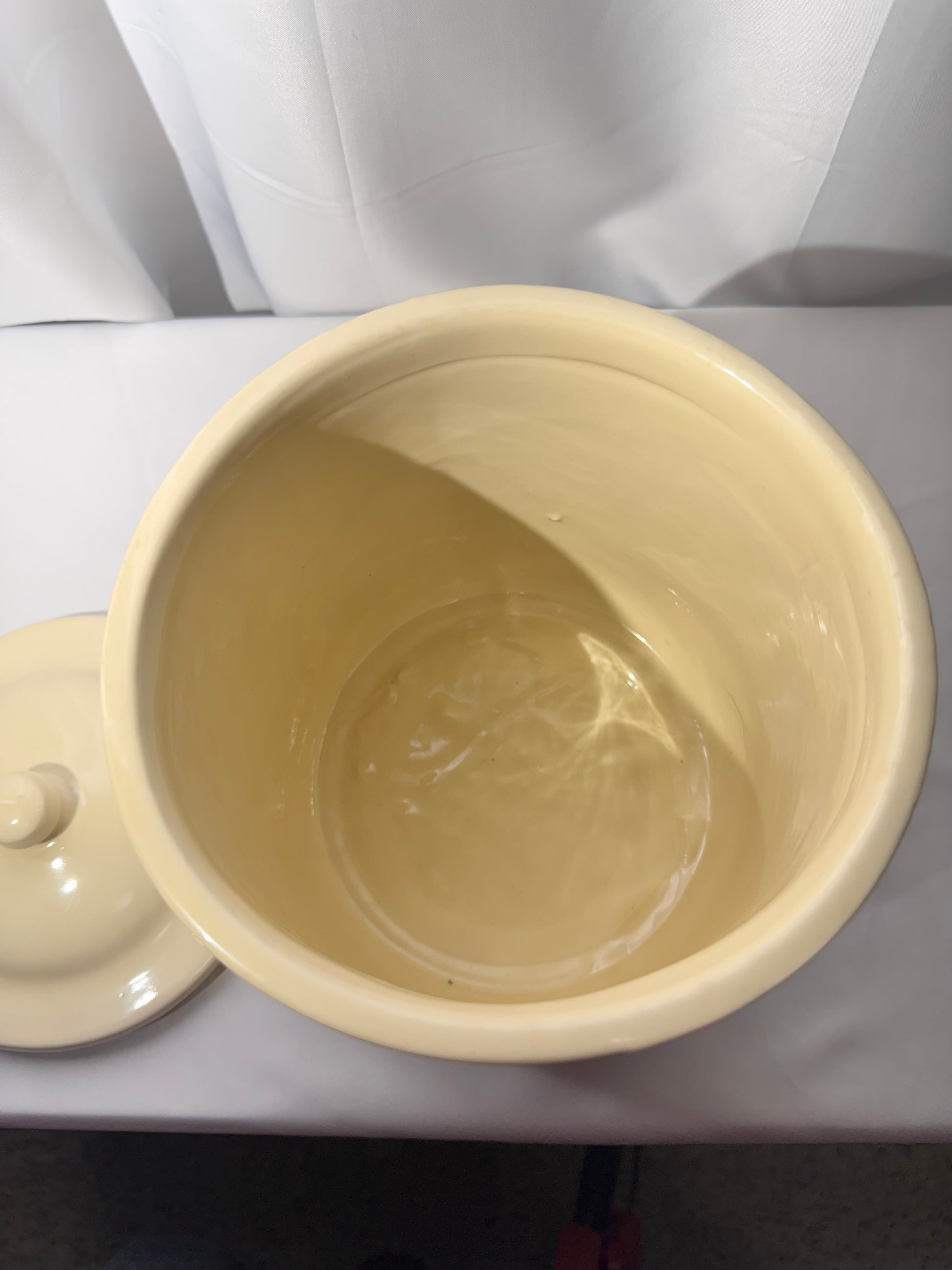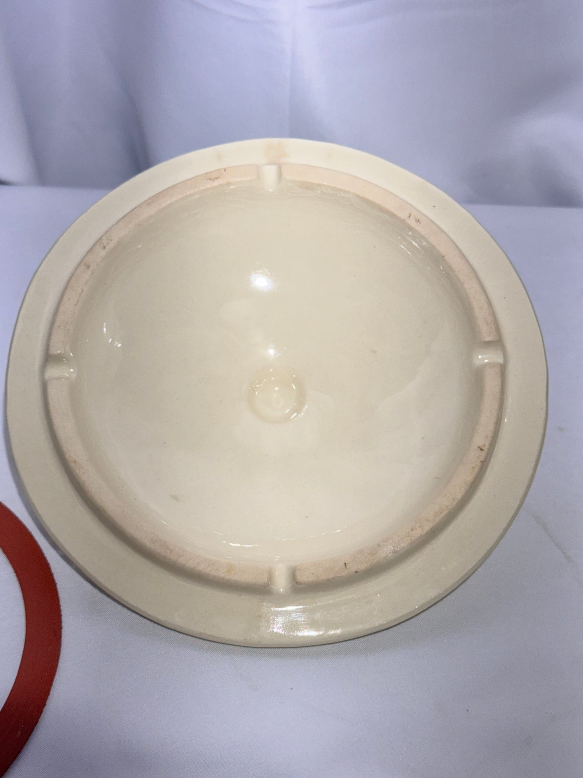 Overall nice vintage condition. Elastic cushion around the rim shows wear and does not stay in place but is original and included. Light crazing noted. No major chips or cracks observed. Please review all photos carefully as they are part of the description.