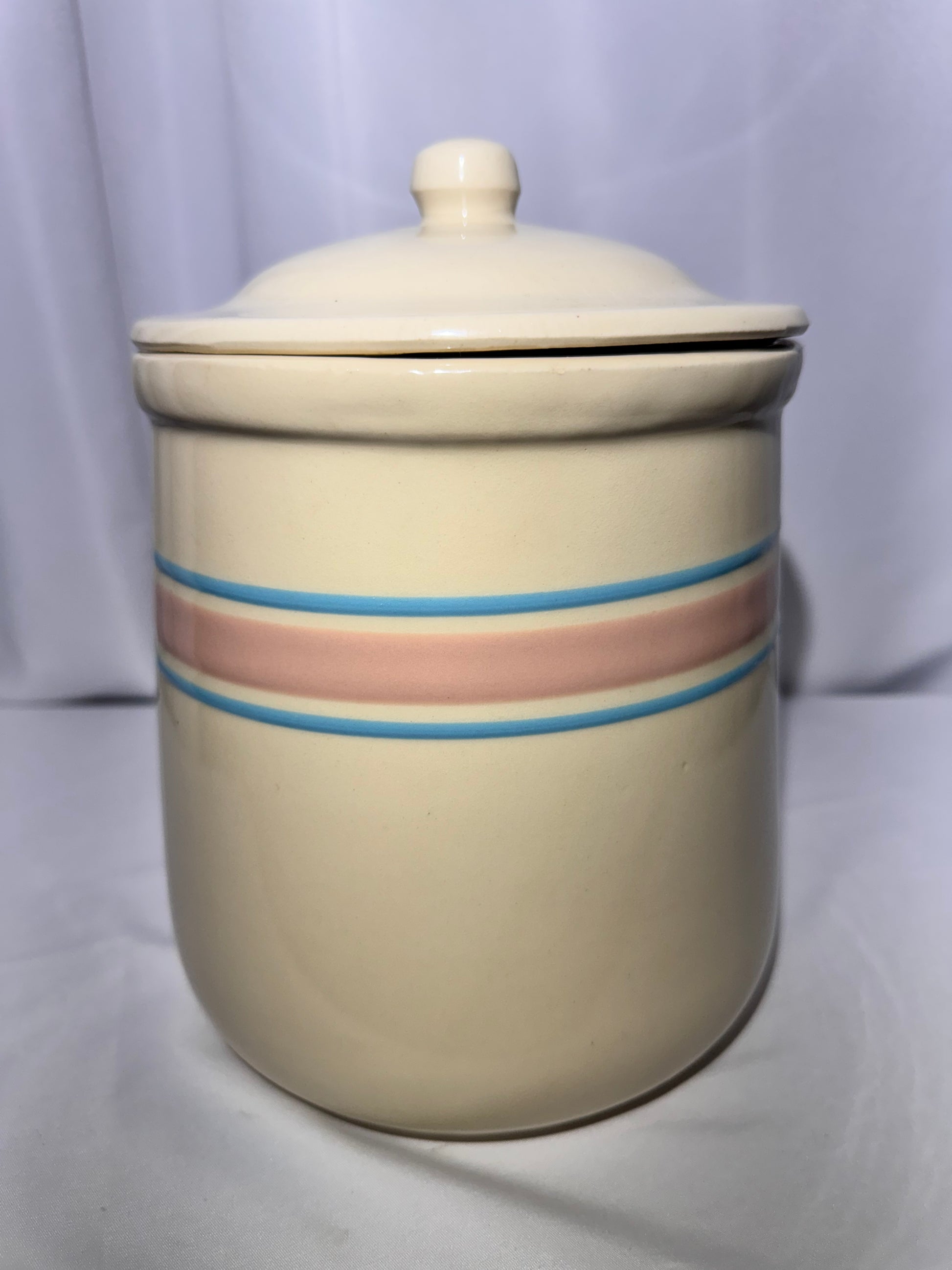 This is a charming vintage McCoy Pottery Stonecraft kitchen canister, marked McCoy USA and numbered 133 on the bottom. It features the classic Stonecraft look with a creamy white base and coordinating pink and blue stripe design, making it a perfect match to other Stonecraft kitchen pieces.
