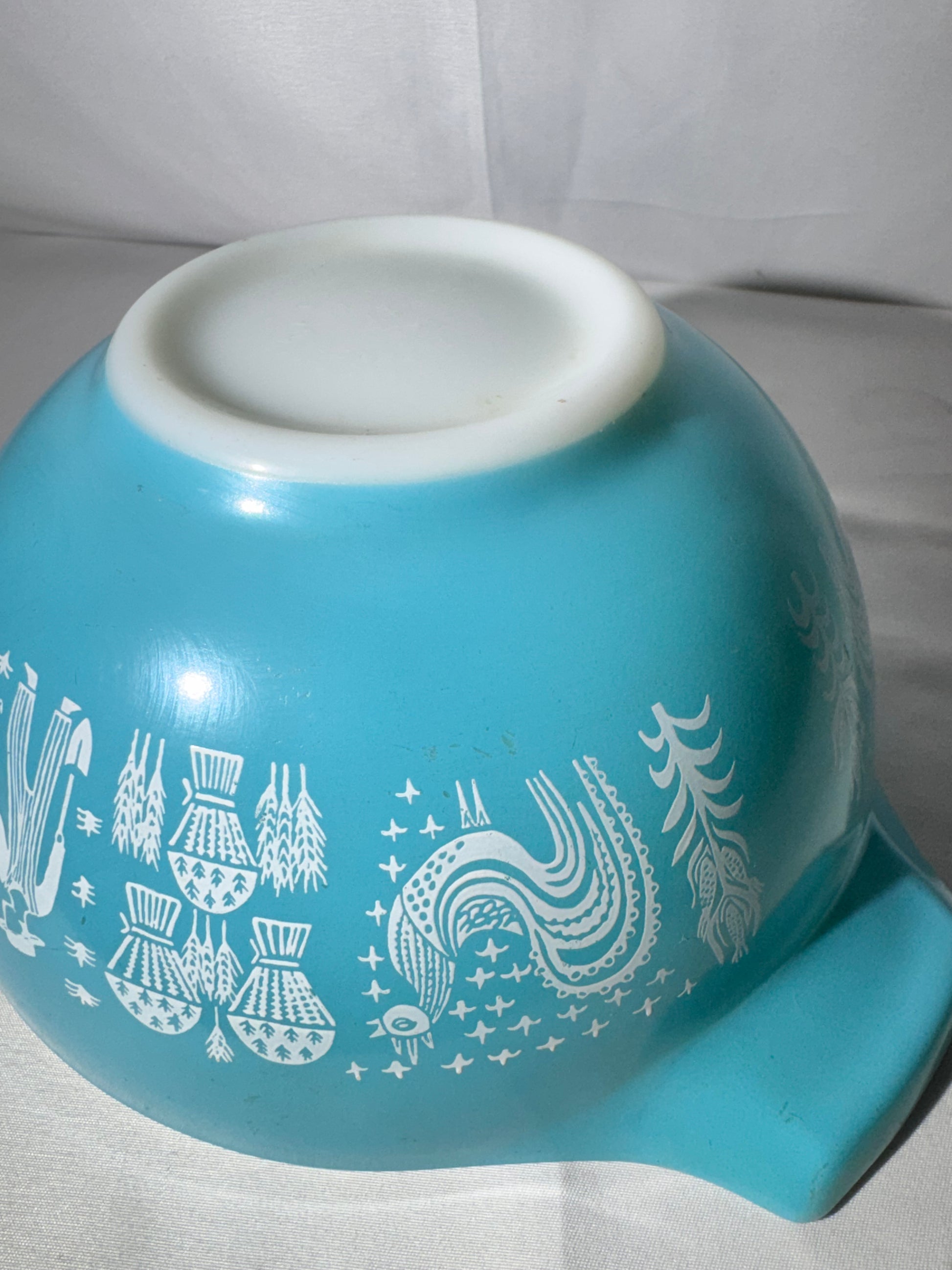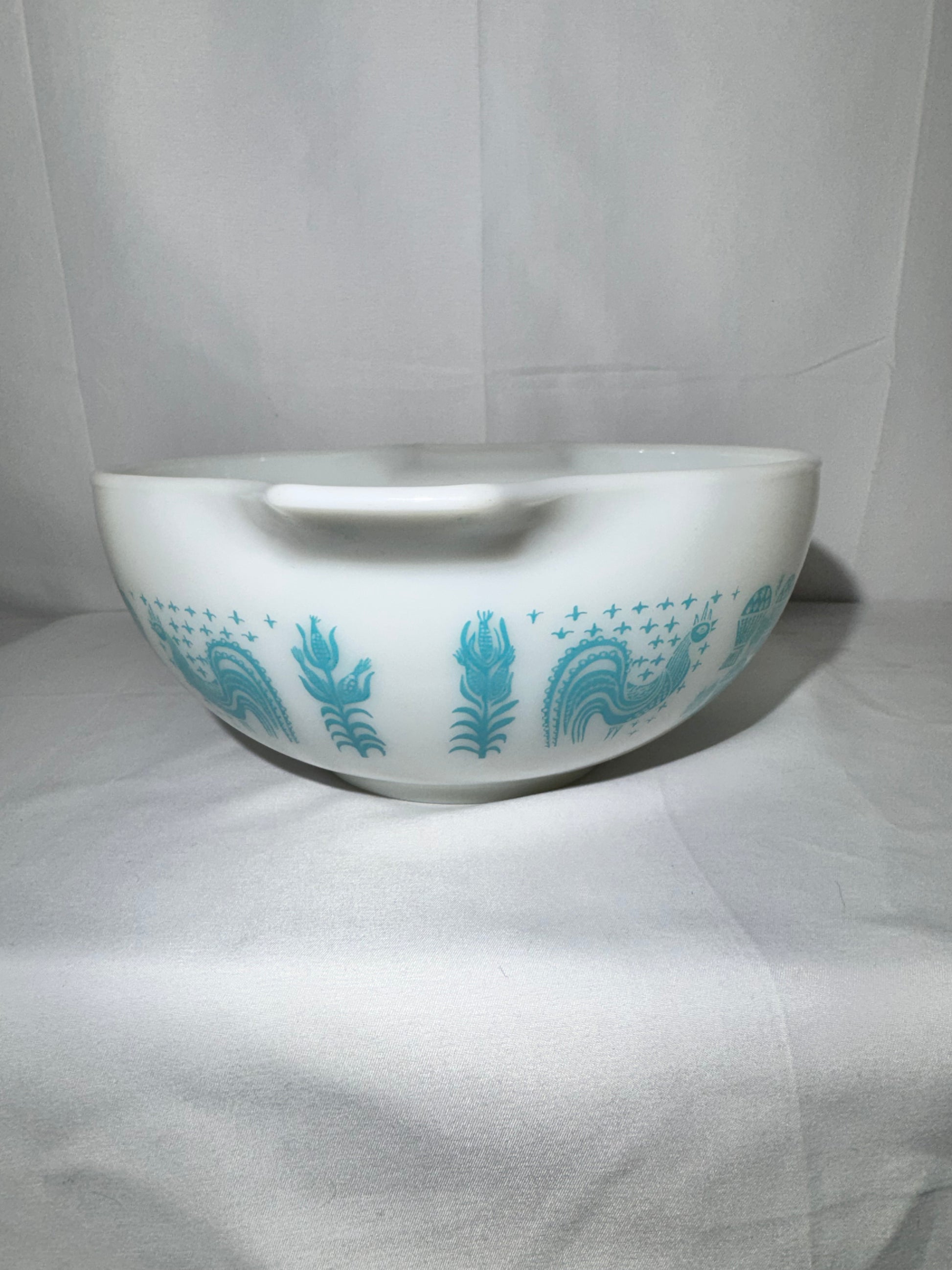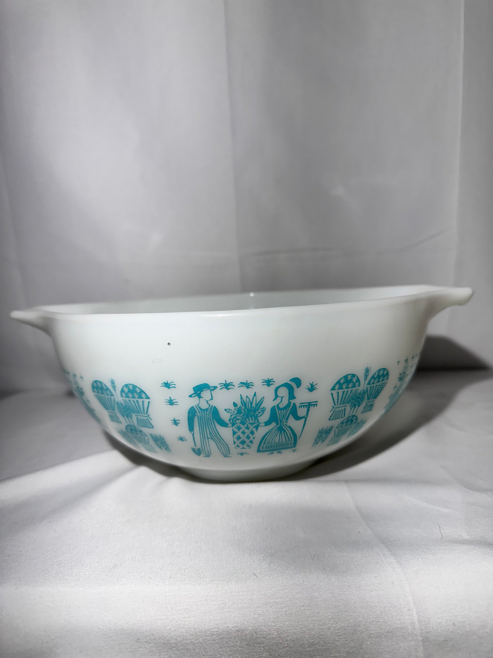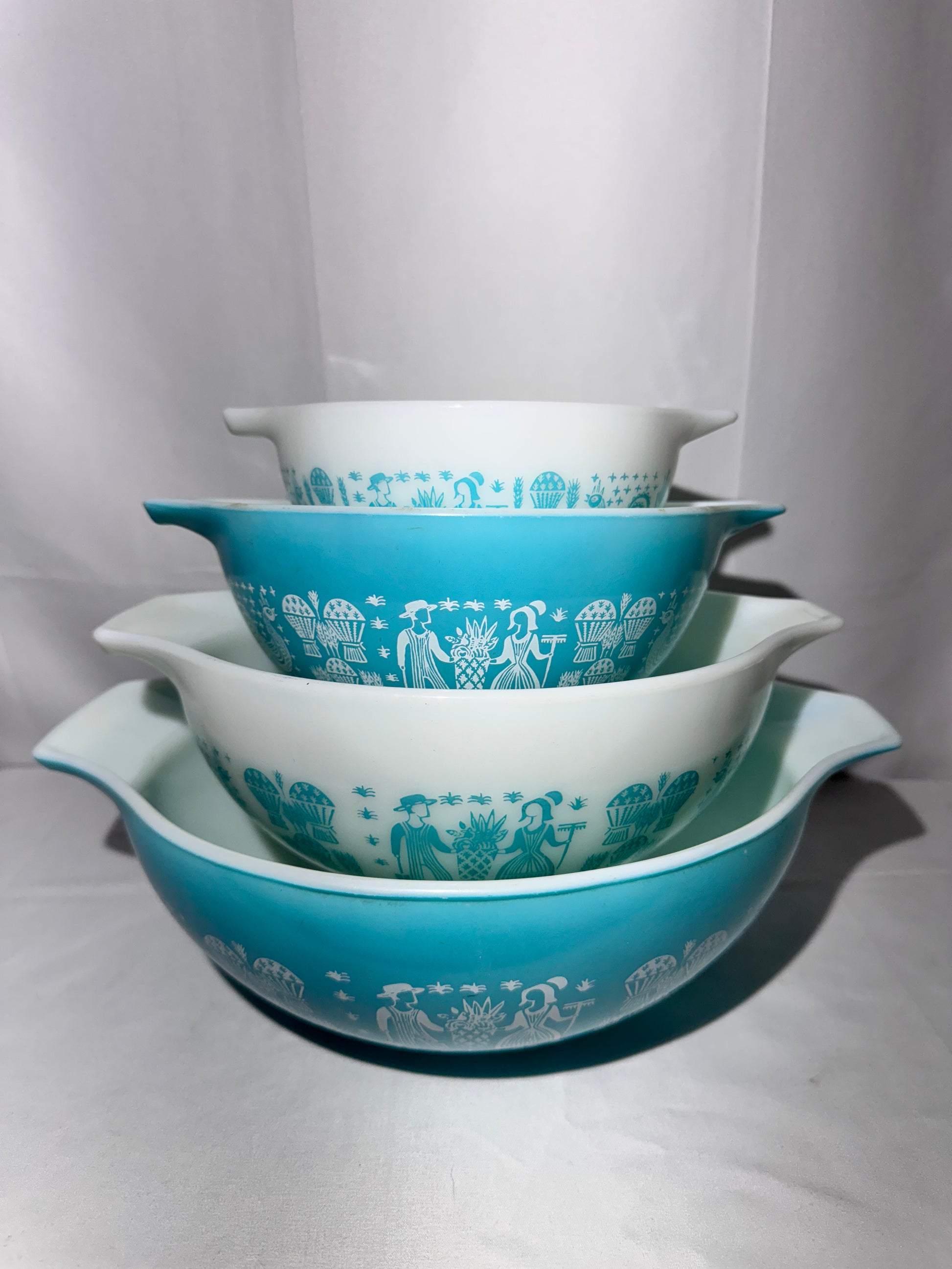Vintage Pyrex Amish Butterprint Cinderella Mixing Bowl Set (4 Bowls) – Teal Blue & White Alternating Colors