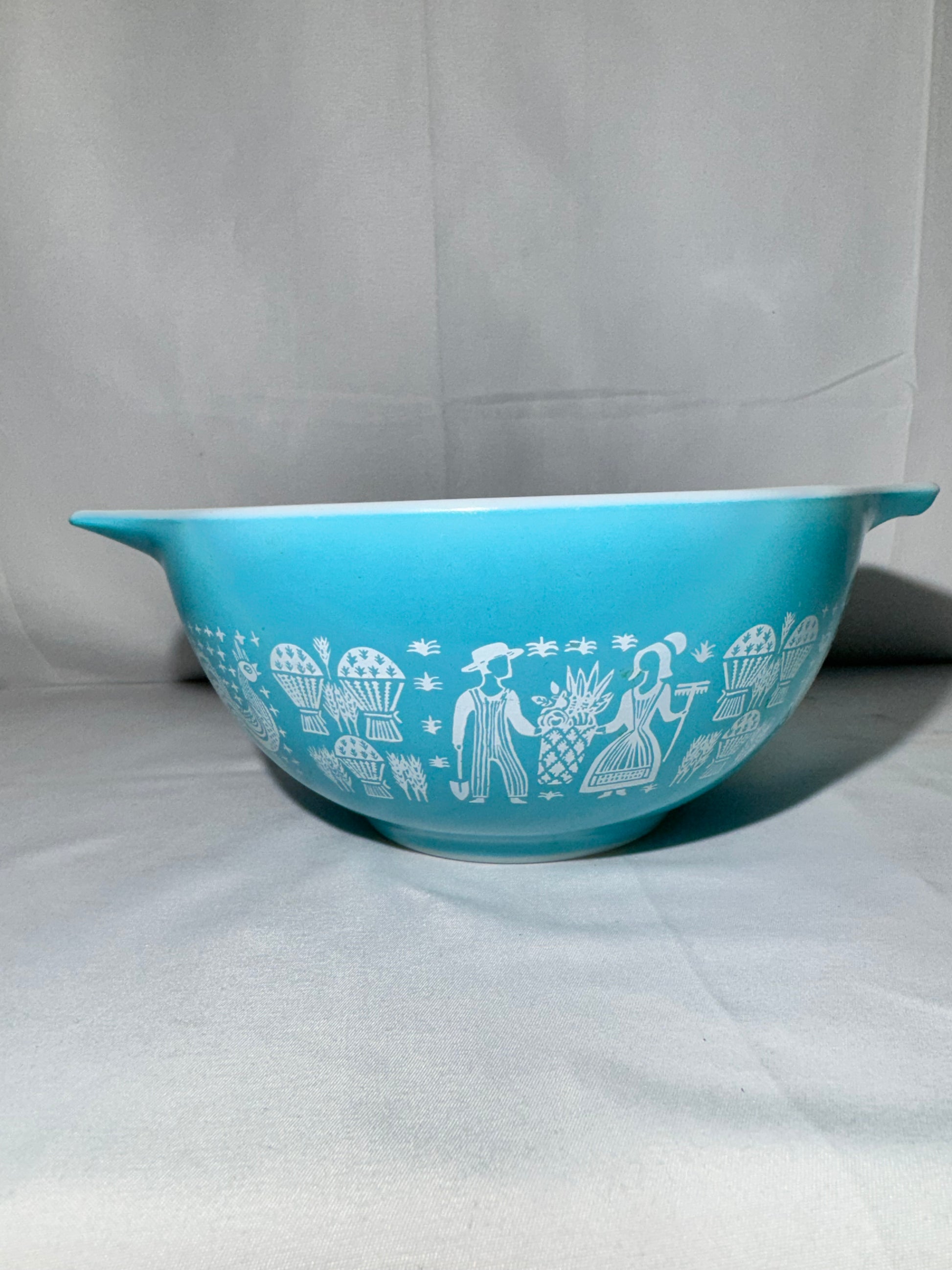 This 4-piece vintage Pyrex Cinderella mixing bowl set features the beloved Amish Butterprint pattern, showcasing classic farm scenes in alternating teal blue and white. A favorite among collectors, this set beautifully combines functionality with mid-century farmhouse style.