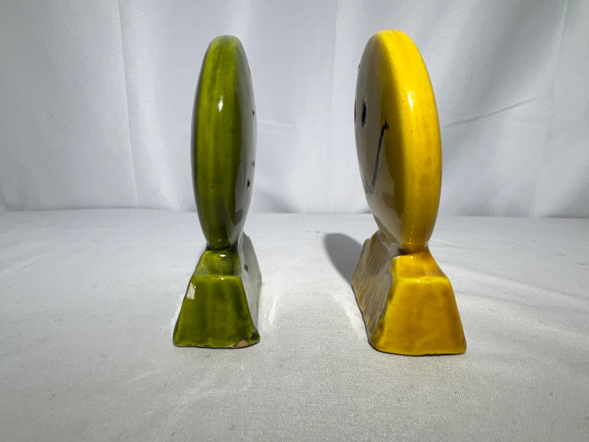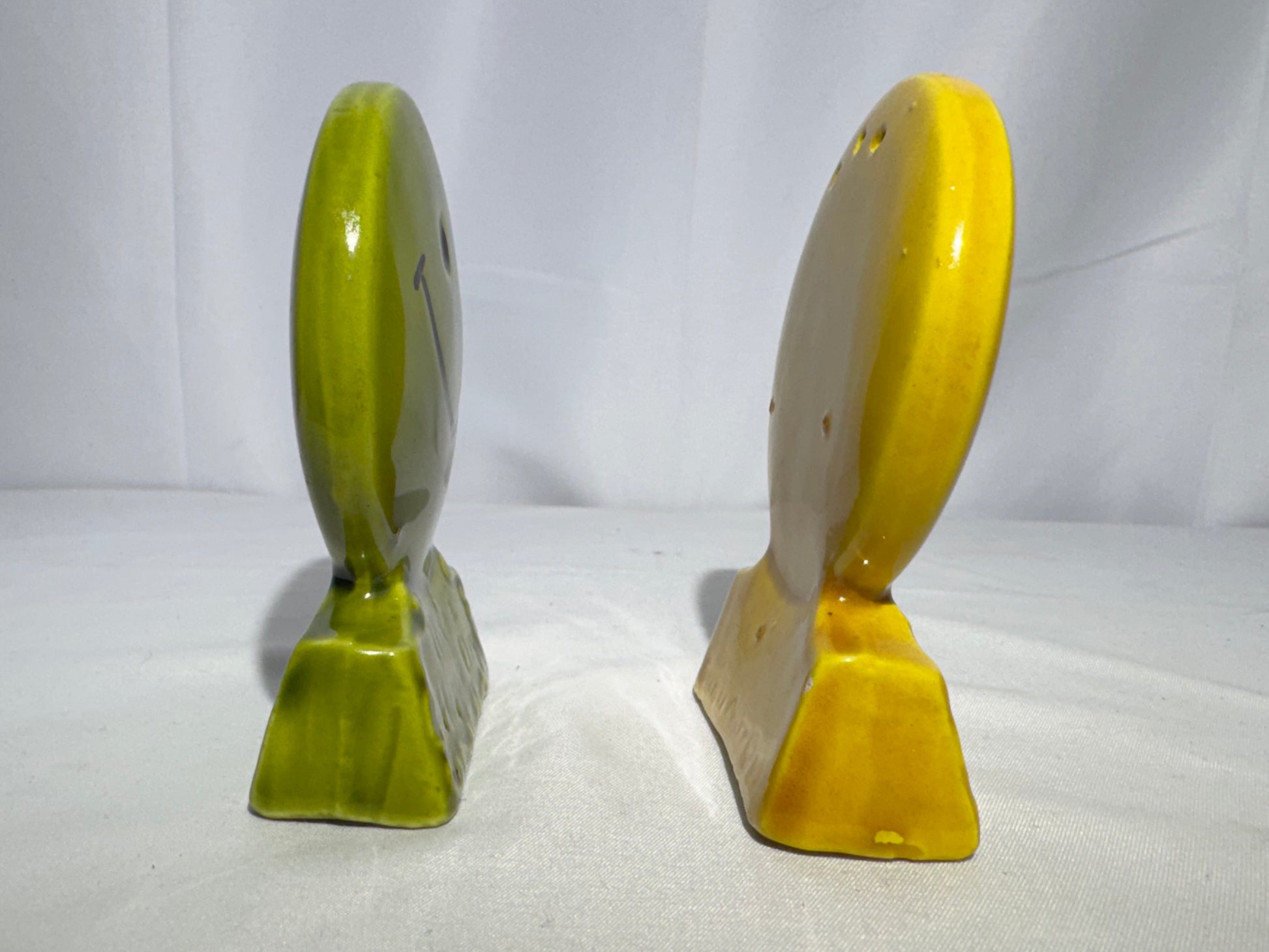 - Condition: Vintage pre-owned. The green shaker has a small chip on the side, which is clearly shown in the photos. The yellow shaker is in good vintage condition for its age.