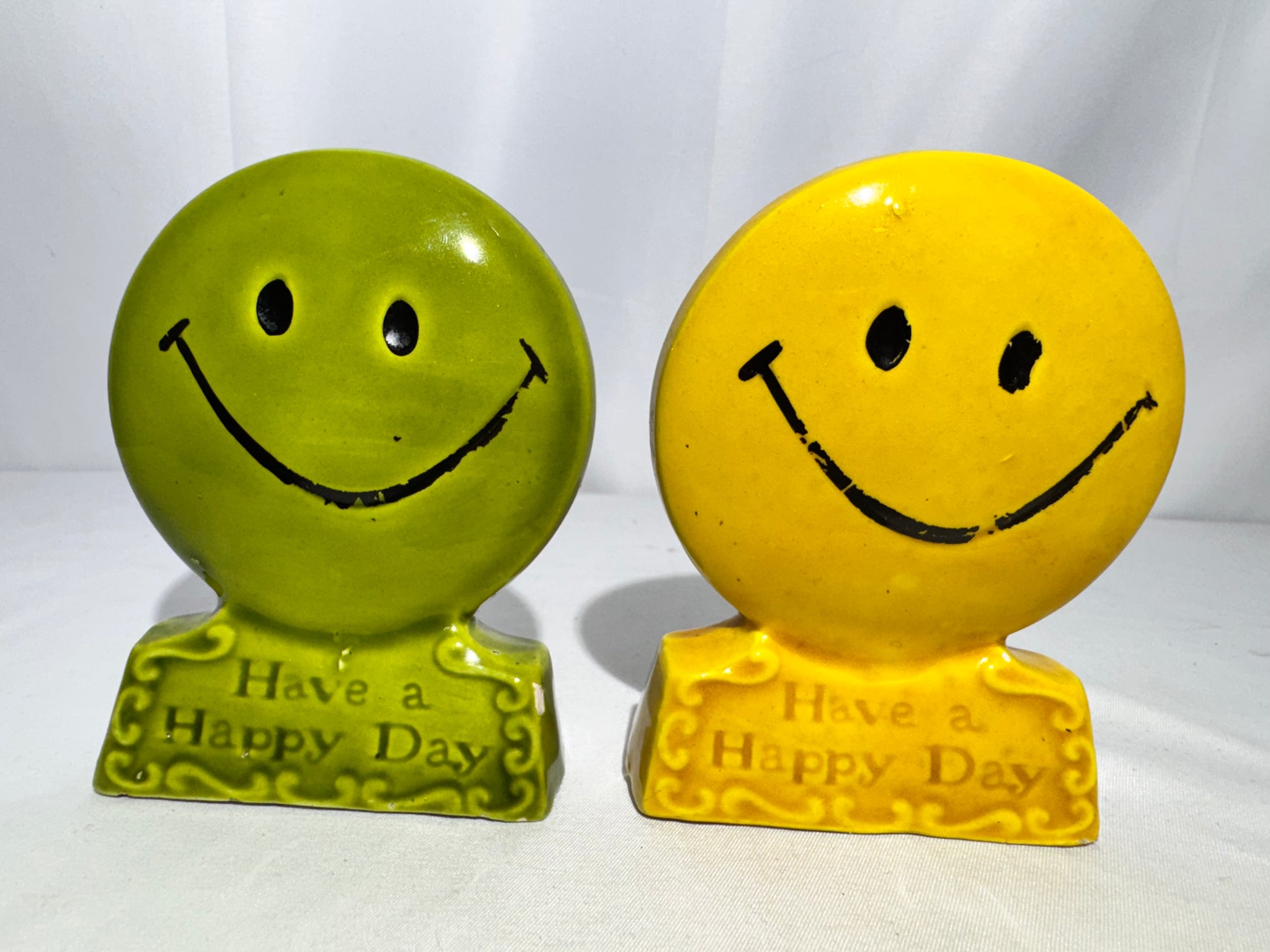 Add a cheerful touch to your vintage kitchen décor with this authentic pair of Treasure Craft salt and pepper shakers from the 1970s. This charming set features the phrase “Have a Happy Day” printed on the base, making them a fun and nostalgic collectible.