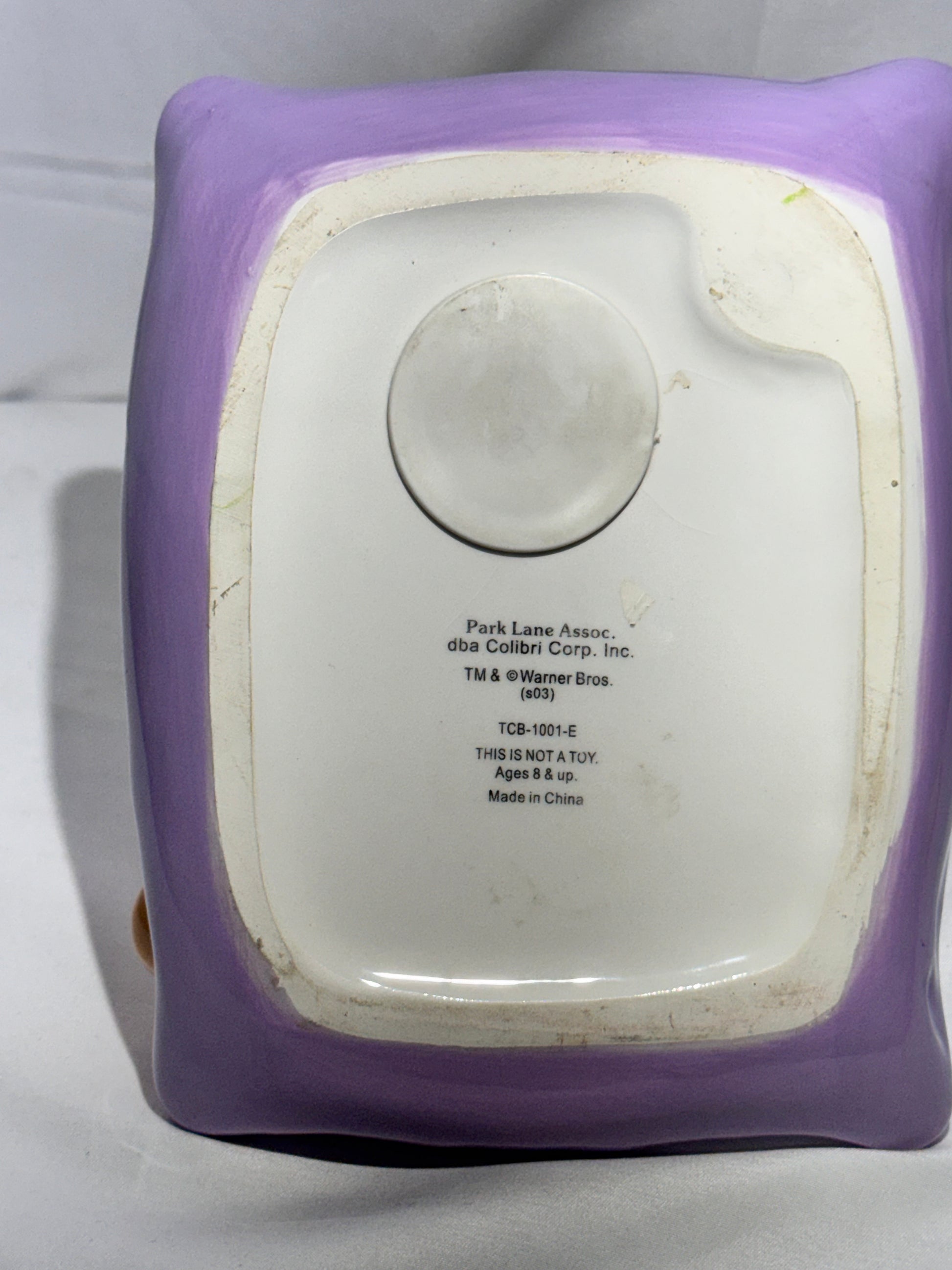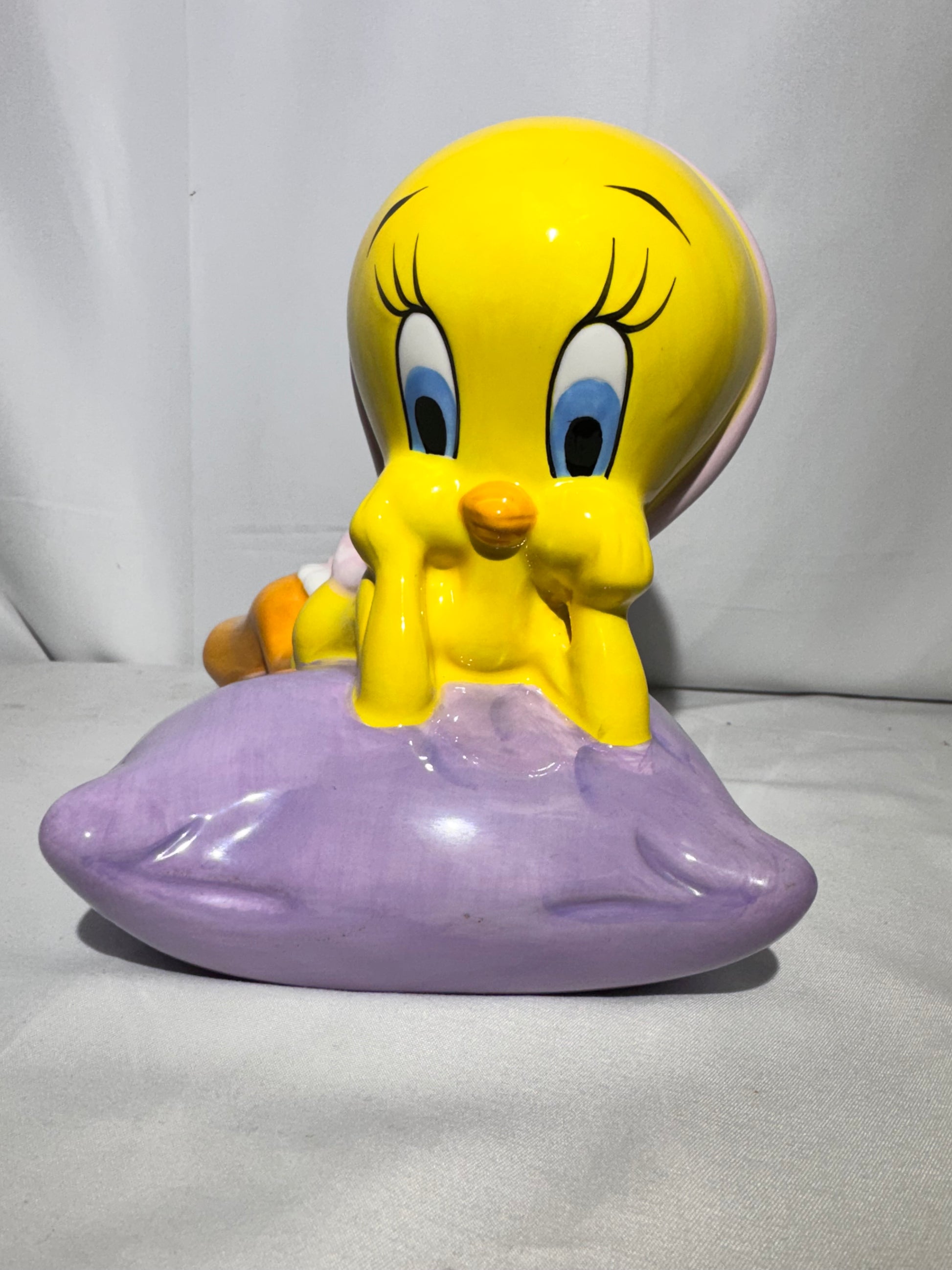 Adorable vintage Tweety Bird ceramic piggy bank featuring Tweety laying on a purple pillow wearing a pink nightcap decorated with small flowers. Produced by Park Lane Associates (DBA Colibri Corp., Inc.) and officially licensed by Warner Bros. and Looney Tunes.
